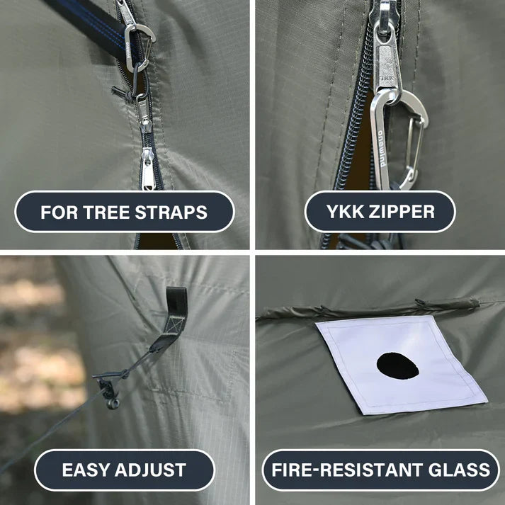 Weighing just 6.4 lbs, this hot tent is a must-have for every adventure. It packs small to 45 x 15cm/17.7"*Φ5.9" and comes complete with the whole suspension kit such as 12x Light reflective guyline, 8x guyline collection, 14x aluminum tent stakes, 2x small carabiners, 2x aluminum guyline tensioners, 1x suspension sack and a compression sack to store everything inside for easy transport and efficient storage.
