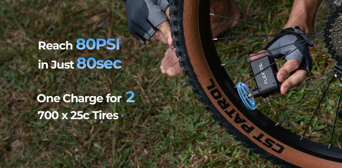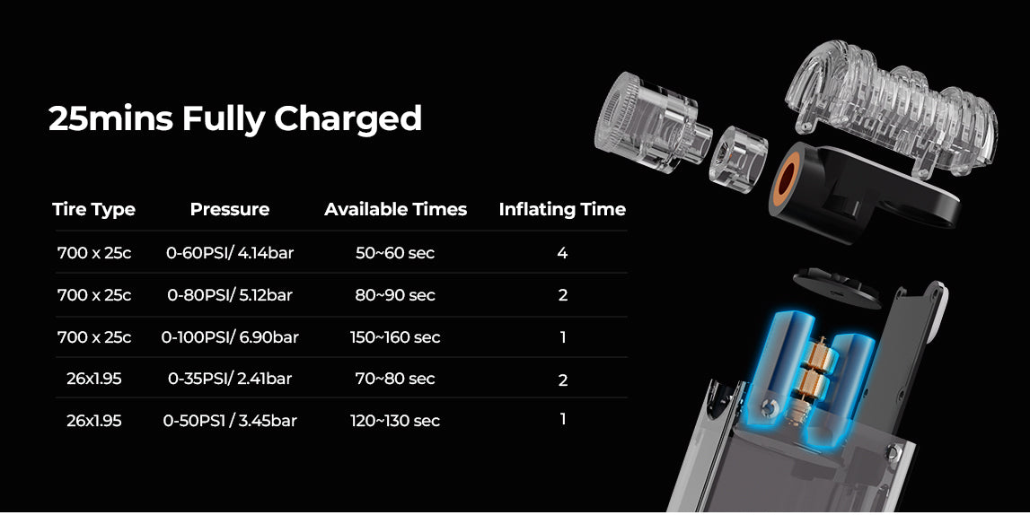 With a high-capacity battery and Airvortech technology, TINY BIKE PUMP can inflate two 700*25c tires from 0 to 80PSI with ease and reach a maximum pressure of 100PSI. It's a reliable and powerful tool that can inflate a tire to 80PSI in just 80 seconds.